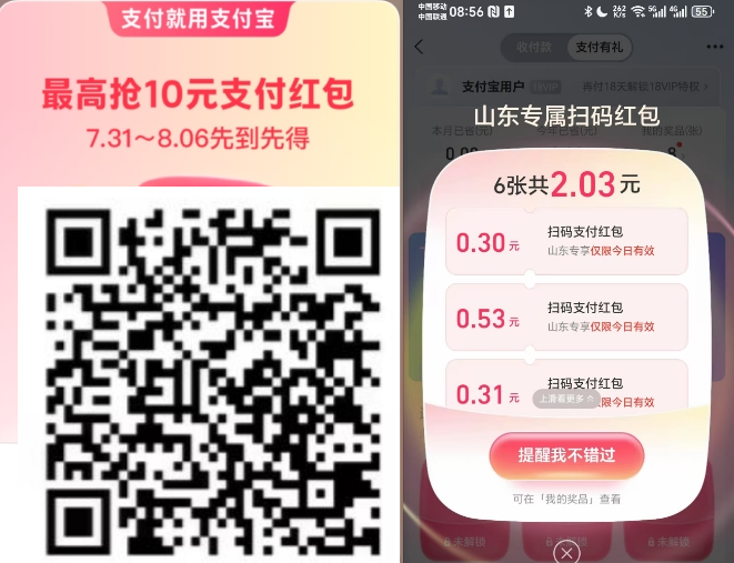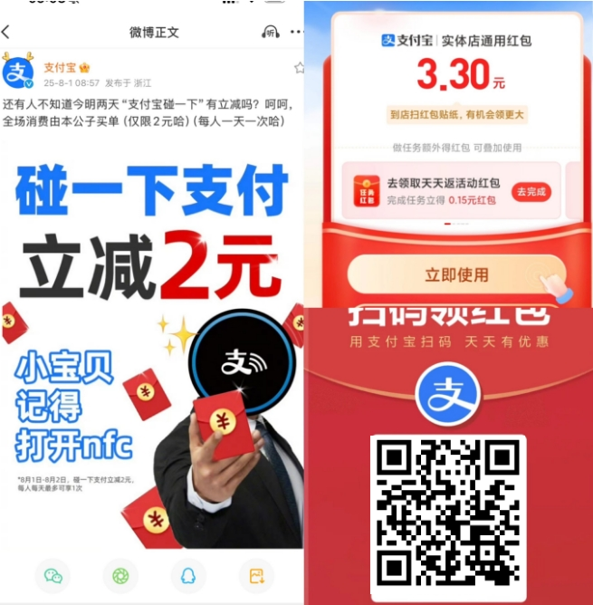 支付宝8.1-8.2号两天使用碰一碰有立减2亓,这个不需要领券直接碰就减,另外可以叠加:zfb识别抽随机实体店通用荭包,7.30-8.5号面额变大叠加:支付宝识别,新的碰一下荭包,与早上活动均不冲突,先领券!开始使用时间为次日叠加:支付宝识别,有多笔地区+扫码立减