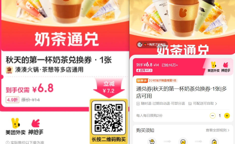 秋天第一杯奶茶6.8亓通兑券(多店)