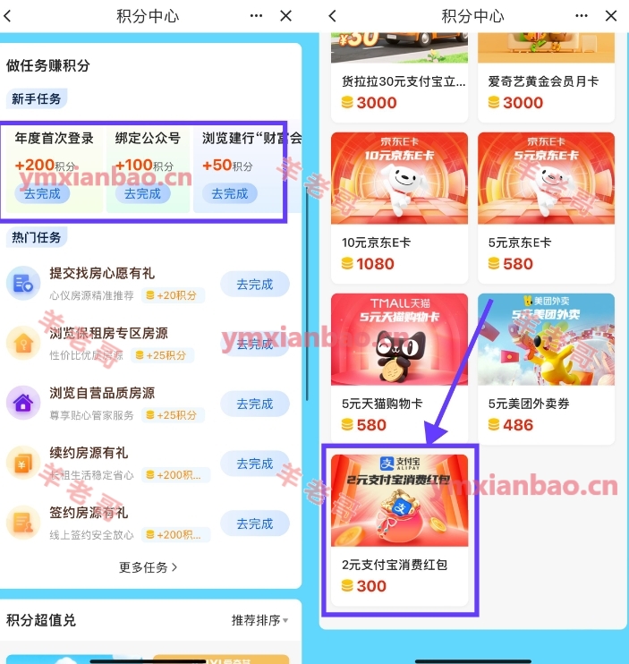 建行APP搜索“建融家园”,点“我的-积分”,首登+200,绑gzh+100,浏览得积分,下拉使用300积分兑换2亓支付宝立减金