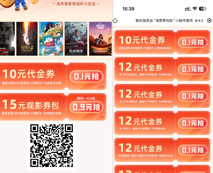 微xin识别,直接0.1亓买10亓电影票券,所有电影都是通用的!每人可买2张券