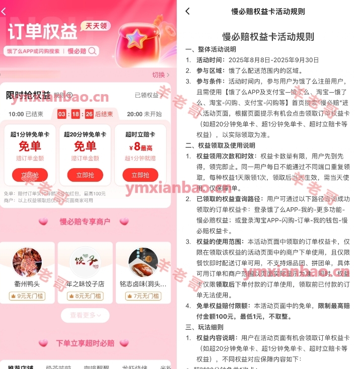 饿了么APP或闪购搜索“慢必赔”,直接领超时1分钟免单卡,送餐超时1分钟直接全免淘宝app识别,每天11~15亓,叠加起来用!每天便宜外卖,不弹券的是黑号,换号,或复制打开淘宝:¥w7Tn4g49puF¥/ HU7405