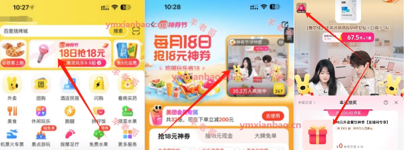 美团app首页抢18,右上角直播间全天抽18无门槛外卖,底部切换大牌俱乐部,右下角抢18-18券进直播,每20分钟抽20-18(有时候会变38-18),左上角福袋抽(不显示是正在抽,等几分钟即可),假分享接即可美团app识别,领不到换号领!美团38-20/58-26/88-30直接拿:http://dpurl.cn/sNjUTt6z不同:今天全天不限量必得:满20减10/满38减20/满58减25/满88减30,策略随机:20~25减6~10,满28减12~18(主力券!)