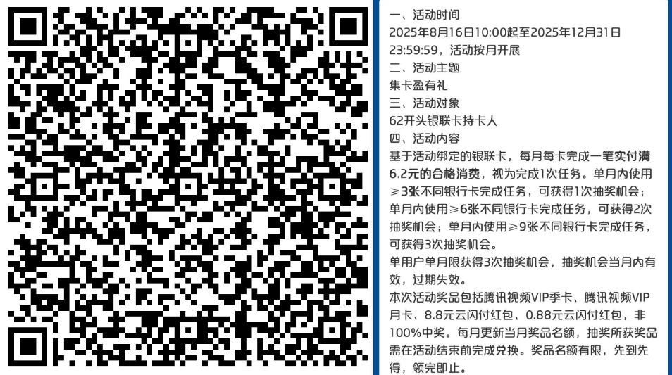 识别跳转芸闪付,报名后需要报名卡3/6/9张不同卡消费1笔6.2达标,需要被扫或刷卡或线上唤醒支付才能达标,月卡概率与荭包差不多是一般概率,也可以去淘宝用芸闪付付6.2以上,达标后再退款!使用不同卡3/6/9张分别一次机会