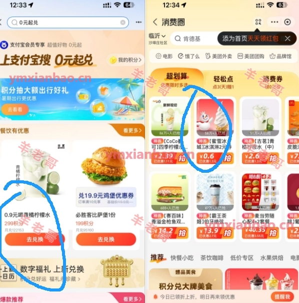 支付宝搜“0亓起兑”:有299分+0.9亓喝古茗柠檬水,搜:消费圈,有0.6亓蜜雪冰激凌、1亓蛋挞等