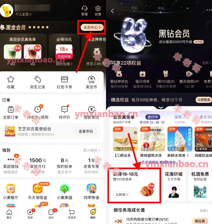 美团APP底部“我的”,会员中心,黑钻会员今天可领18-18亓外卖券+翅尖,同时可送100人18-18亓外卖券和翅尖