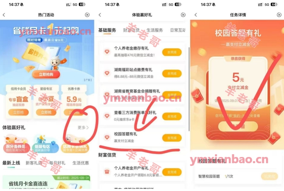 农行app首页热门活动,体验赢好礼,更多,校园答题有礼,答3题抽立减金 ,有的人没任务,如果提示升级中,反复进就行了,可以在农行冲水电费话费