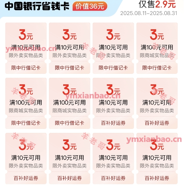 京东app搜:中行省钱卡,2.9r买,有很多10-3可以外卖或者买实物用,需中行卡付