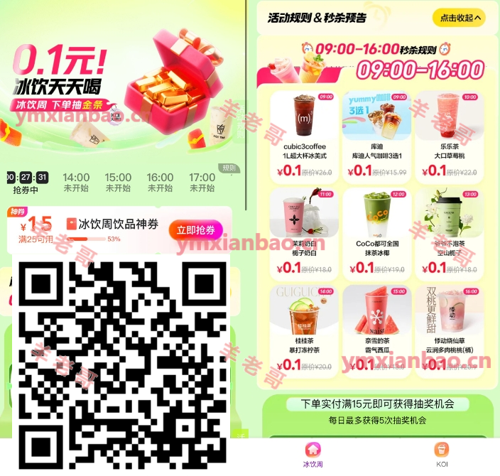美团/微xin识别,每个整点25-15亓饮品券,下拉还有0.1亓奶茶,仅限上海地区可用