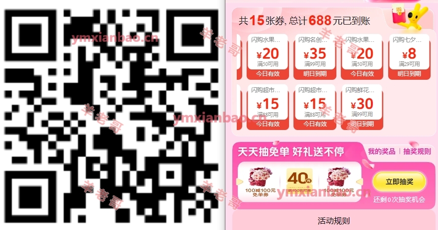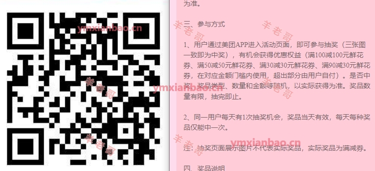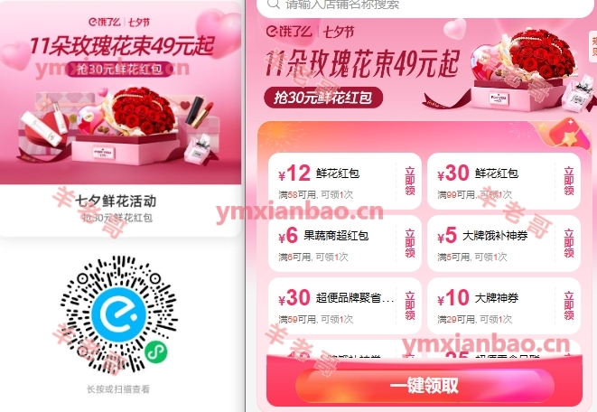微xin或美团识别,直接领鲜花补贴券,内含100-40/79-30/99-30美团第二个:饿了么鲜花99-30,鲜花29.8起