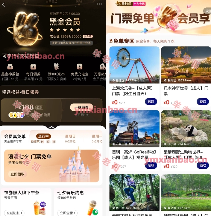 美团APP底部“我的”,会员中心,黑金和黑钻可0亓买景区