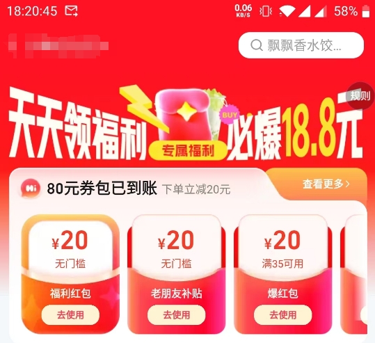 饿了么app识别,部分有20无门槛如图,没有的尝试右上角切驻马店再去扫码试试
