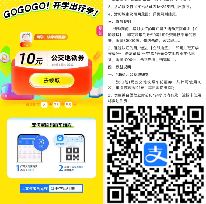 支付宝识别,限16~24岁可领10亓公交地铁券,单笔立减1亓, 限量5w份,先到先得,还可抽1w份33笔2亓出行蜷7天有效期9.20截止