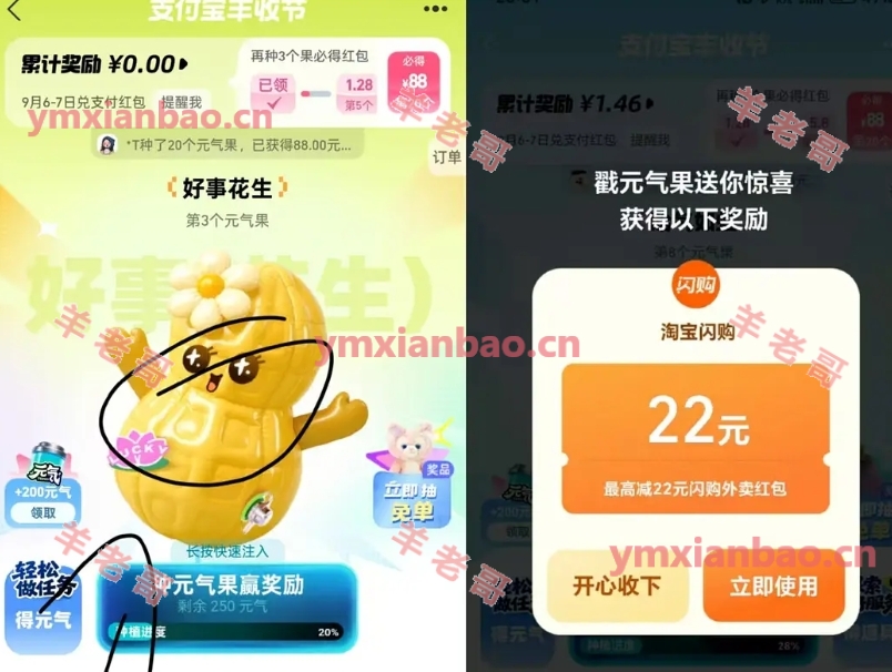支付宝搜:丰收节,进去点元气果一直点,部分账号有淘宝闪购22亓无门槛,不弹则无