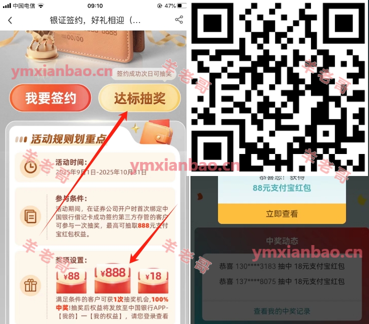 跳转中国银行APP-点我要签约(退出去任意证券app开户或换绑(自己开过的证券换绑也可以),实测国投证券可以直接换,不需要卡面),绑中行,二类也可以,次日回页面抽,18/88/888支付宝立减金,页面规则最低18,有反馈以前参加过的不是首绑的重复绑本期也可以抽