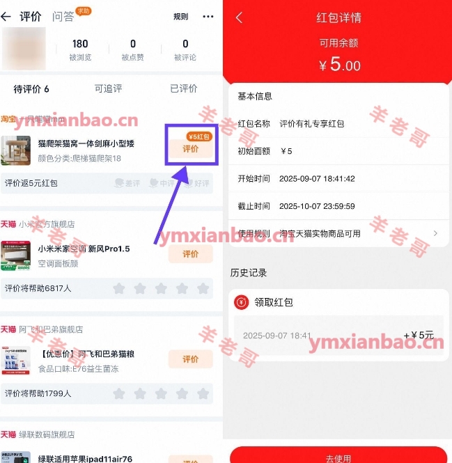 淘宝APP底部“我的”,找到待评价的订单,有提示红包小字的就去玩,通过后自动发放