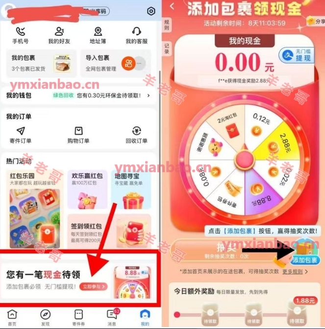 菜鸟app最新版,底部“我的”,如图, 每添加1个快递单号得1次机会可抽最高8.88,一天内添加7个额外有1.88,去jd、dou音、pdd等啥,复制一下快递 添加上去就行了