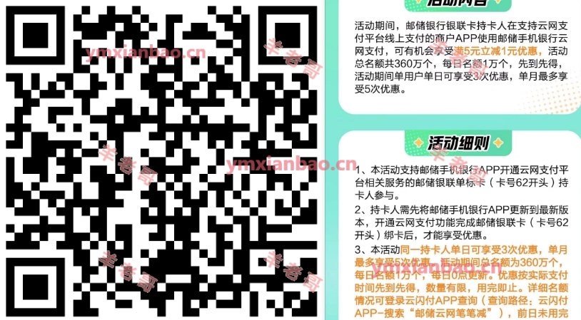 邮储云网线上5-1亓,单人每月可享五次优惠,当天最多三次,网上国网app,充电费5,付款时先选银lian,再跳邮储app。也可以移动话费:移动app,充话费,自定义5(部分地区最低10),选择芸闪付,不出优惠是名额没了,次日0点恢复