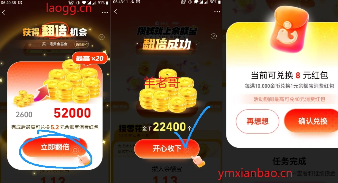 支付宝app搜攒钱,多次机会抽金币,点翻倍,会有基金/余额宝攒钱计划,按计划进行,兑换后去关闭定时转入等,转出/基金和黄金直接去理财里边撤销就可以,多号实测8+5+7。使用方法:不同名咸鱼抵扣/线下/线上均抵扣
