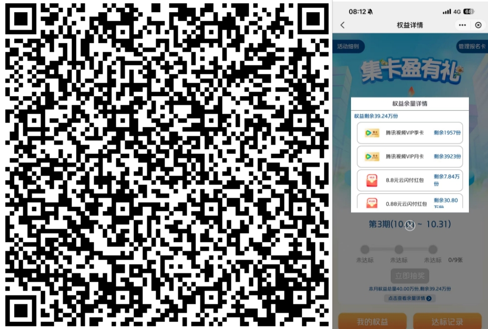识别跳转芸闪付(进不去点左上角活动细则,再返回就显示了),报名后需要报名卡3/6/9张不同卡消费1笔6.2达标,需要被扫或刷卡或线上唤醒支付才能达标,用微xin.xyk还款,跳芸闪付,9张借记卡还款6.2以上也能完成,也可以去淘宝或者美团用芸闪付付6.2以上,达标后再退款!使用不同卡3/6/9张分别一次机会