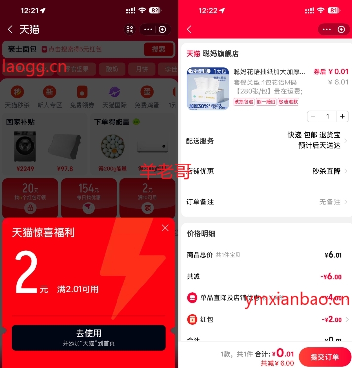 支付宝搜索“天猫”,点小程序进入活动,自动弹2亓荭包,随便找个便宜的东西买即可