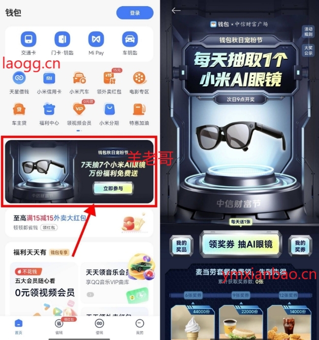 仅限小米或红米手机参与,小米钱.包APP 首页,如图横幅”秋日宠.粉节”每天领1张奖券,累计6/9/12张可领麦当劳兔单券