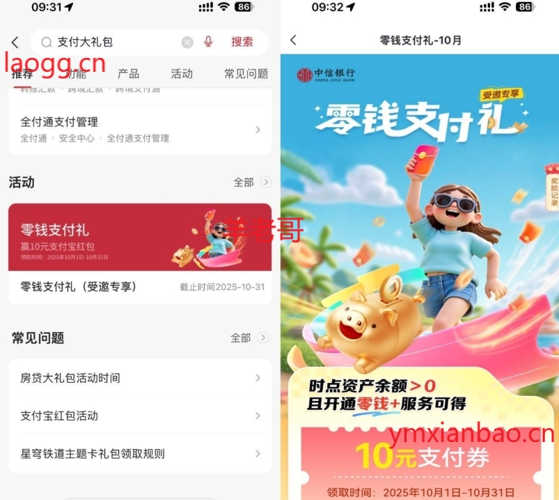 中信银行APP搜索“支付大礼包”,下拉点横幅进入,受邀用户可领10亓支付券,二类以上自测,领取弹窗去完成,卡上余额大于0并开通零钱+即可,需2-3天任务进度更新完成。显示特邀的,历史开通了的不行