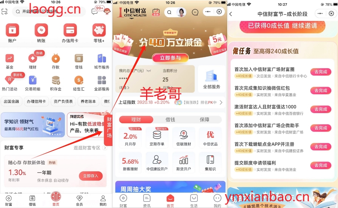 中信APP-右下角财富广场-财富广场-顶部横幅分40W立减金,完成任务领成长值,每100成长值换1亓立减金