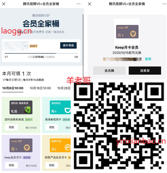 V5及以上会员直接领Keep会员月卡,兑换码可自用也可以咸鱼出了