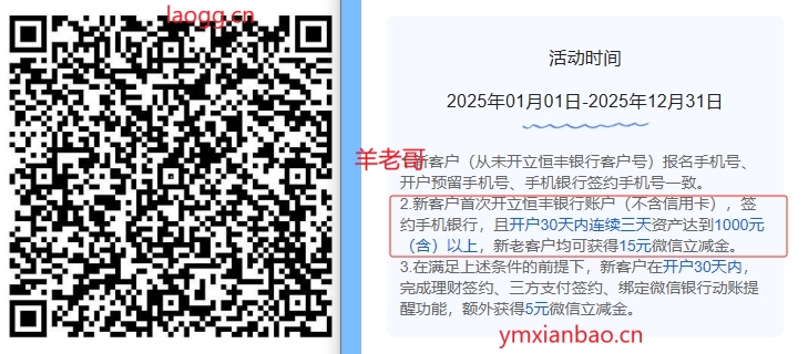 恒丰银行新用户报名后,首次开立恒丰银行账户,不需要定位,并签约并且在30天内,连续三天资产达到1000亓以上,放电子卡内余额就可以,可得15亓微xin立减金,完成签约额外5亓,绑定抖音/京东/拼多多还有立减5优惠,扫码报名: