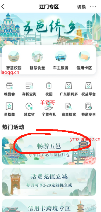 农行app-搜:城市专区-右上角切换到江门-畅游五邑-支付10笔1.08后必得5块微xin荭包,支付10笔金额1个工作日内会原路退回(笔数较多,或会引起卡风控建议间隔时间久)