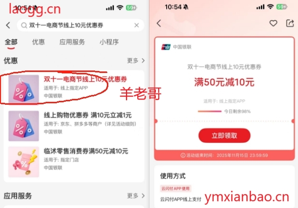 云闪付搜:双十一电商节线上10元优惠券,买实体e卡可用,规则内的app抵扣满50-10通用