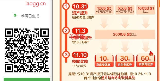 微xin识别,先报名,看规则,最高60亓京东券①满足9月日均余额低于5W可报名 ②10月31前自由选做 1-5(w) 5-10(w) 10+(w)任务,所对应奖励不一样 ③11月3号前再提升存2000+就能完成任务 11月10号领券