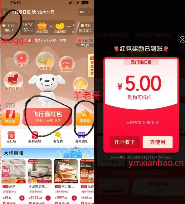 京东app搜索:飞行好礼997,领奖励进入做浏览任务做个10多个就行,然后飞行领荭包,攒够180个飞行币,左上角飞行币进入抽10次得5亓通用,每次抽奖也有额外的,加起来有5-7,如是黑号飞行币较少