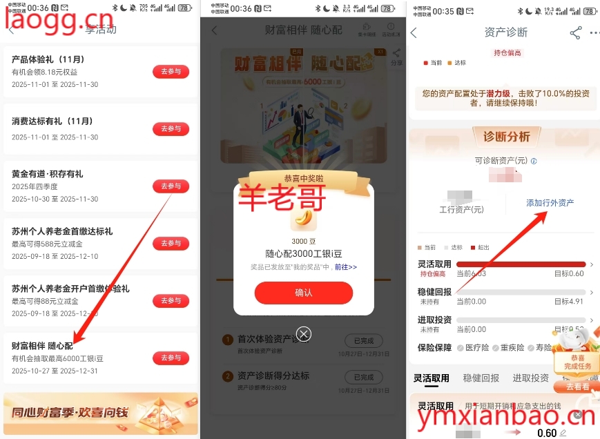 工行APP ,“任务中心”,享活动-如图四个财富相伴 随心配,试试抽3000工银i豆,第一个需要首次,第二个添加外行,每个填2w看表低的再对应项增加。可以换立减金,我的-工银i豆可以兑东西,或者攒着以后再换微xin识别,1100豆就可以换1立减金:mp://kVwTqfYuaJ4Ekap