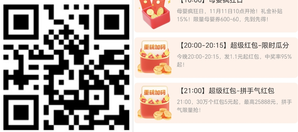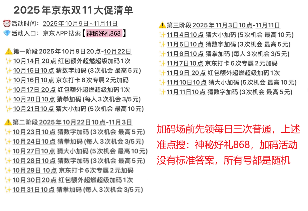 今天20点额外加码1.18/3/5/20.28亓通用购物荭包,除黑号都有,需卡20点或今天20:00~20:10均有,提前需用光三次普通机会才能进加码。京东app搜索“神秘好礼868”,反复进去抽3次,荭包都是无门槛的领几天都可以叠加。每抽1次再重新搜索进去抽,可以领多次,很多一分包邮实物,拆分使用也可以叠加使用,做任wu集火力每天再领12,都是无门槛的可以叠加双11的多个活动,时间表可保存查看: