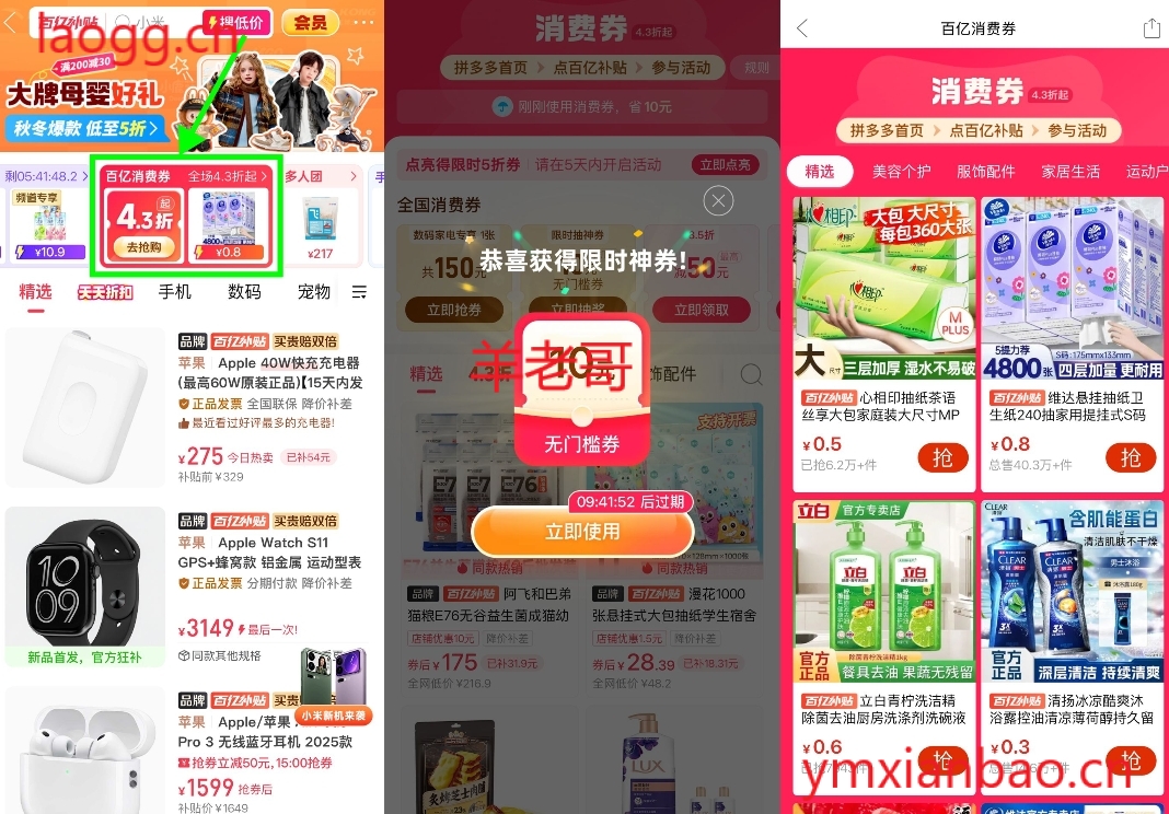 10点去试试!拼多多APP首页“百亿补贴”->百亿消费券->抽10亓无门槛券,有很多几毛包邮的大牌实物