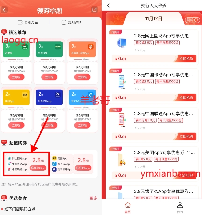 交行APP搜索“领券中心升级版”,每天可领0.01亓买10-2.8亓电费券或话费券,如果提示领完了可以次日10点尝试