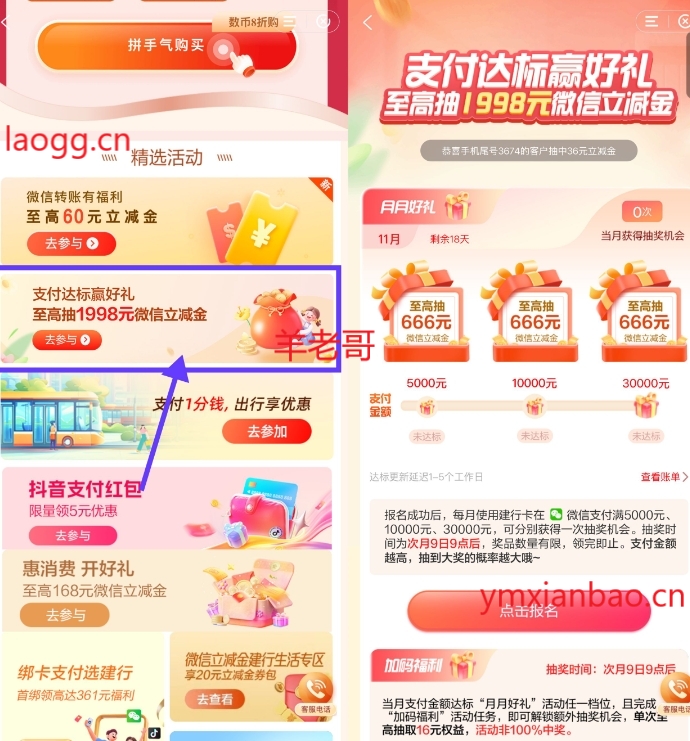 建行APP搜索“惠省钱”->下拉点横幅进入->先去报名一下->累计消费满5k/1w/3w亓各得1次机会,抽最高1998亓立减金