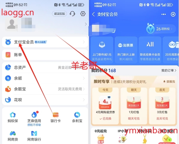 支付宝搜索“支付宝会员”,部分人有3天兑换1+3亓荭包,如果常用的号没有可以换小号看看,如果没有积分,可以去每日签到里攒一下,以免第三天不够(不会太多500内足够)