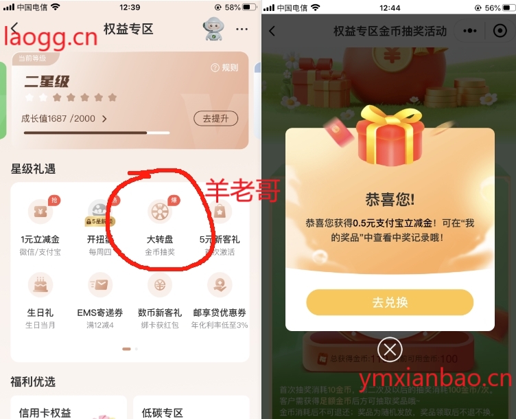 “邮储银行”APP,我的页面-权益专区-大转盘,完成简单的浏览拿金币抽多次,刚中3次0.5