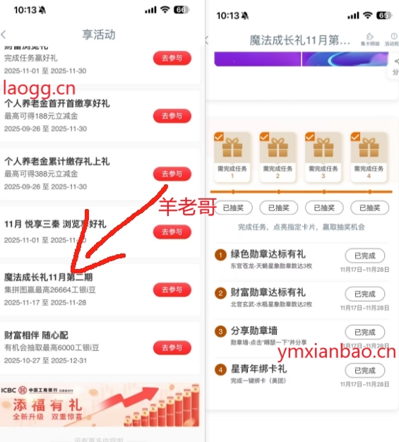 工行APP ,“任务中心”,享活动-如图魔法成长礼,部分没有活动。可以换立减金,我的-工银i豆可以兑东西,或者攒着以后再换微xin识别,1100豆就可以换1立减金:mp://kVwTqfYuaJ4Ekap