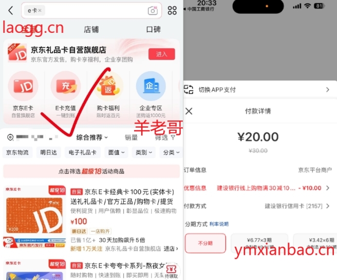 京东搜e卡,需要卡密的看步骤二买这个忽略,如如图选e卡充30,付款选芸闪付,再切换建行App有30-10,不是建行生活 ,如果提示未安装APP或版本过低,先确认是不是最新版,如果是最新版,还不行就清除数据,然后再跳转二:可以去搜e卡,去官方店铺找自定义,电子卡,30加入卡包,可以在订单查看卡密