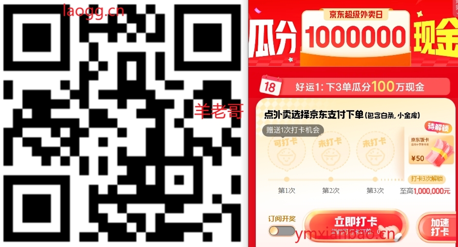 点加速打卡,部分号任务简单不用点外卖就可以打卡,瓜分百万+抽一万张50亓饭卡。需使用京东/白条购买的外卖订单,订单完成可打卡,1笔对应可打卡1次,累计打卡满3次,即可参与瓜分,今天20-23:59淮时瓜分,错过时间默认放弃