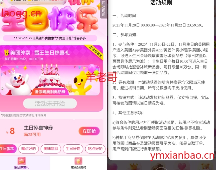 这个活动持续3天,20-22日每天10点可以抢10W份新品免单,10点开美团APP搜:外卖生日礼,如果是11月生日可以在页面直接领试试