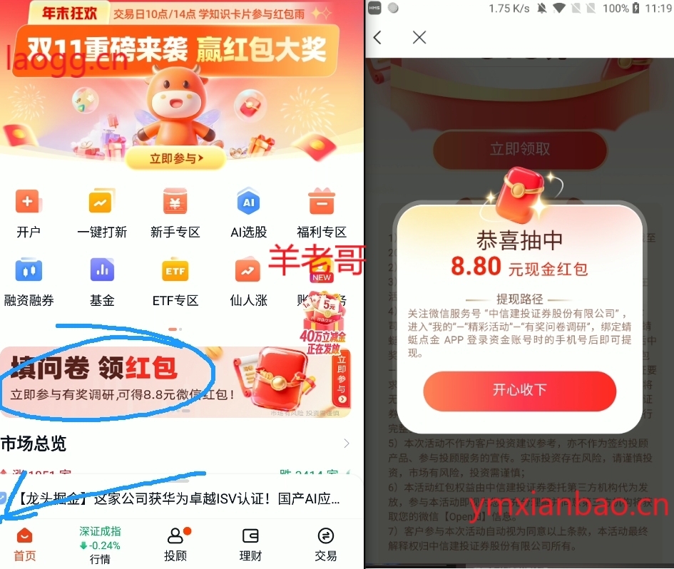 以前开过户的看看,没开的忽略。蜻蜓点金(原中信建投证券)app首页滚动横幅问卷进,没有入口可以大退app重进看看,只有部分人有。没入口的自测:首页头像 投诉与建议 在线顾问 在线咨询 发地址 就能点进去 https://activity.csc108.com/activity/guess/