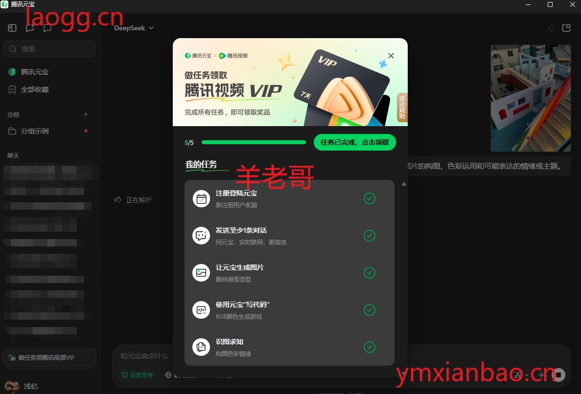 电脑下载“腾讯元宝”客户端,左下角点开挨个去完成,即可领7天腾讯视频会员