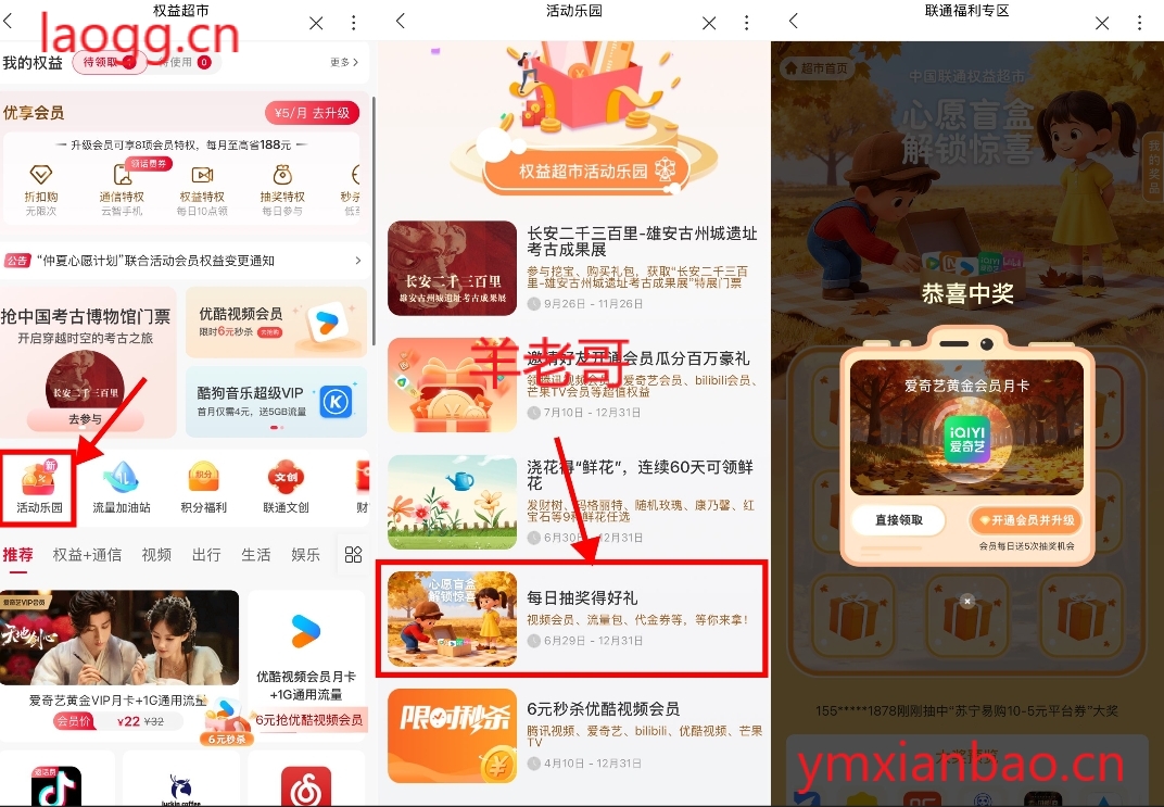 联通APP搜索“权益超市”,首页下拉心愿盲盒,简单浏览得次数,抽爱奇艺或腾讯视频会员等,联通APP搜索“优享会员”可100积分兑换1个月会员,每天可得5次机会