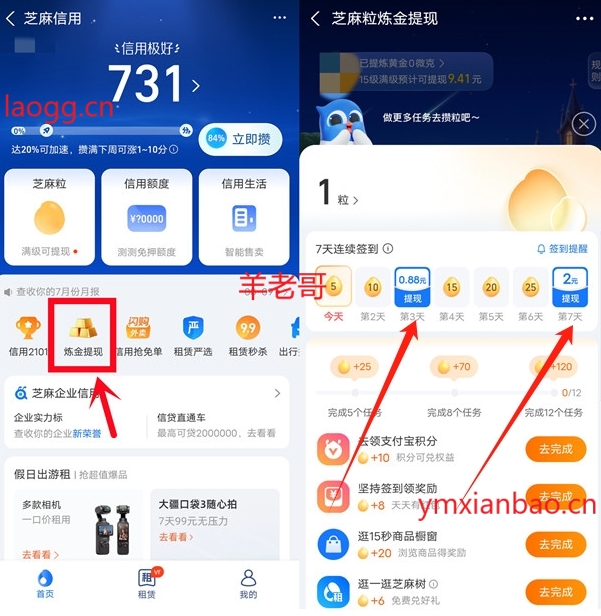 支付宝APP搜芝麻信用,炼金提现,签到7天2.88。如果图片第3/7天不显示如图,就不可以参加,炼金到15级还可领9.42