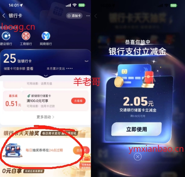 支付宝,我的-银行卡,下拉,yh卡天天抽,做任务抽立减金