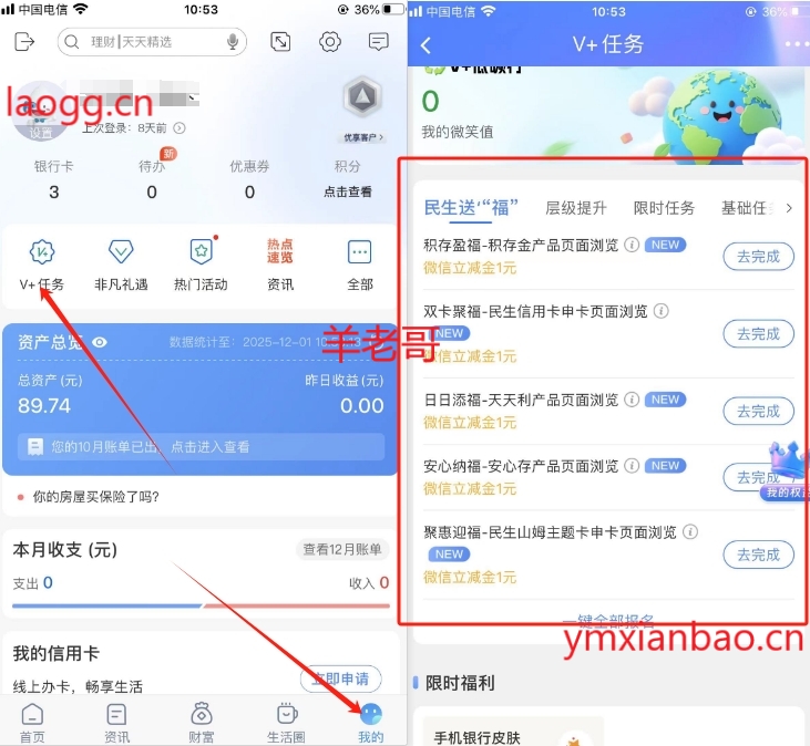 民生app,v+任务,民生送福,浏览得1亓微xin立减金,有5个